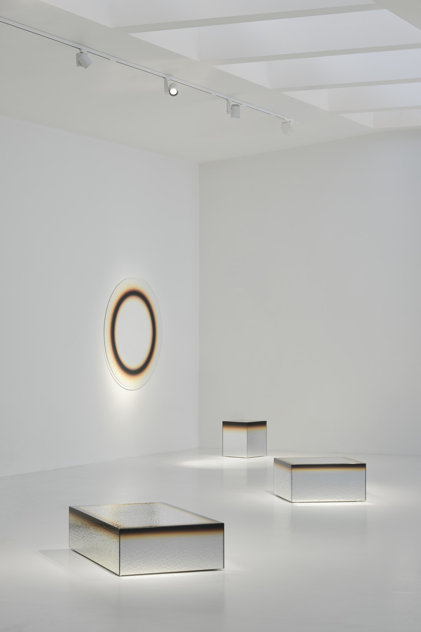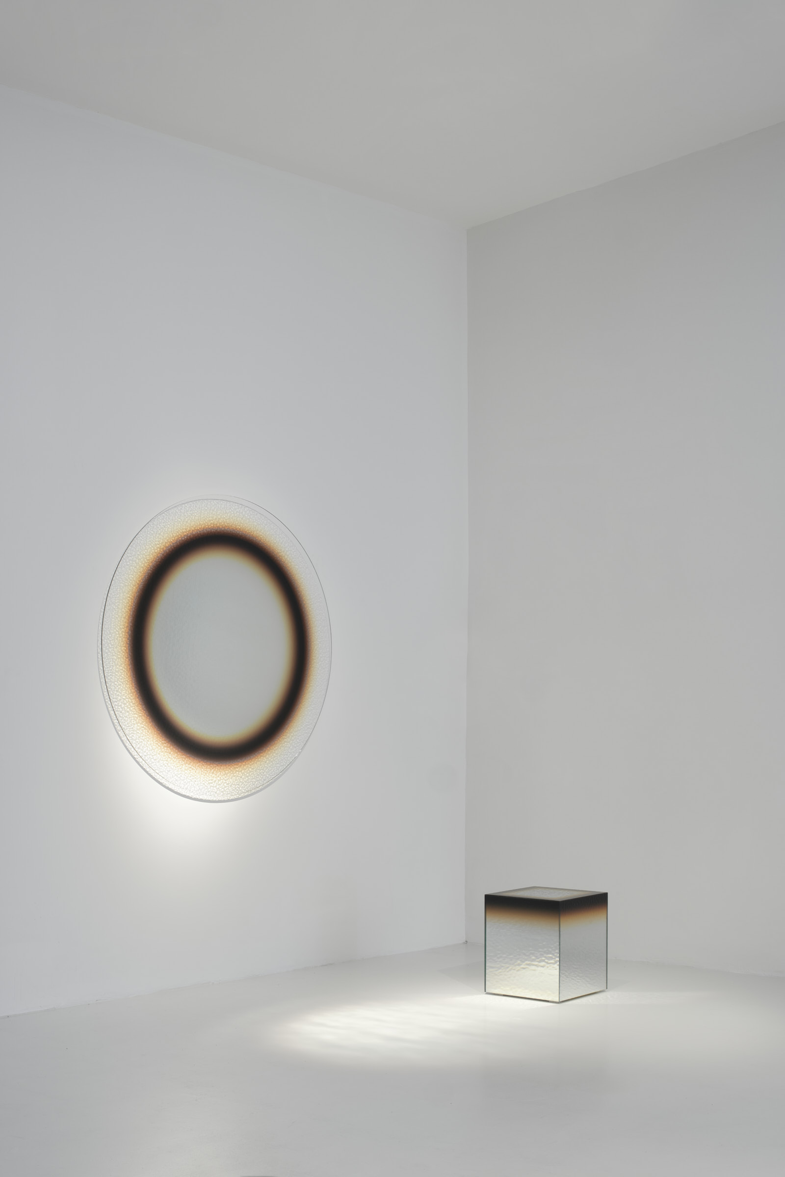 Oculus Celestia is an object suspended between sky and earth. Its central surface, with a liquid-like effect, reflects like moving water; a surrounding glass ring enhances its lightness, while a golden gradient merges the materials, evoking sunlight gently resting on water. The piece recalls those quiet moments when the sun reflects on water, creating shimmering glints that seem to form a visual bridge between sky and earth. In this balance between transparency and matter, light and reflection, Oculus Celestia becomes a symbol of connection and contemplation. It invites the gaze to pause, to slow down, to enter a suspended space where the visible opens up to the invisible, and where light and matter engage in silent dialogue.